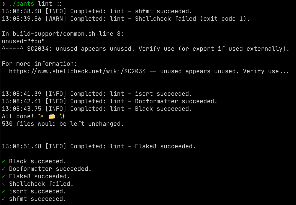 Pants will run these tools concurrently with your Python builds. For example, you can lint your Shell scripts at the same time as linting your Python code (Flake8, Black, etc.), all with a single consistent interface: ./pants lint ::.